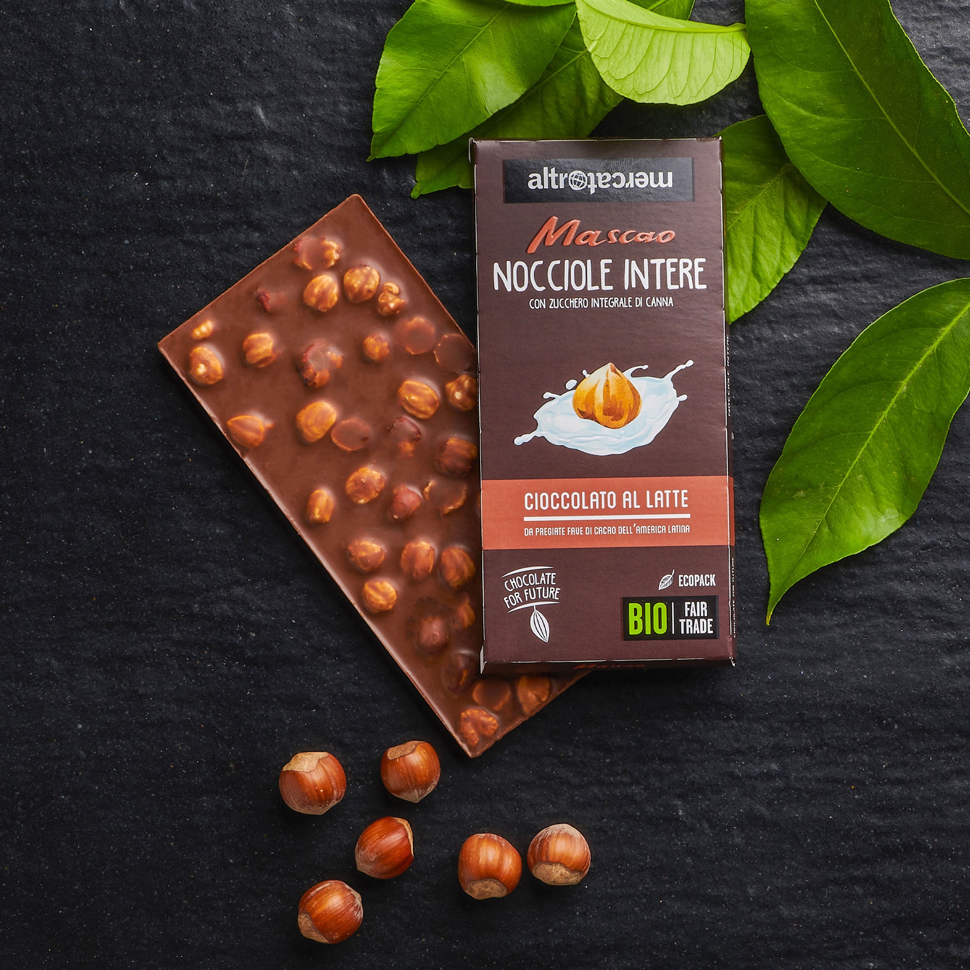 Mascao al latte e nocciole è un cioccolato che si caratterizza per la ricchezza di sapori ed aromi. Unisce la morbidezza del cioccolato al latte alla croccantezza delle nocciole intere, mentre lo zucchero integrale di canna Mascobado dona piacevoli sfumature di sapore. E' prodotto con cacao e zucchero di canna provenienti da produttori del commercio equo e Solidale. Nuova confezione plastic free, con involucro interno biodegradabile e compostabile e involucro esterno realizzato in carta certificata FSC®.