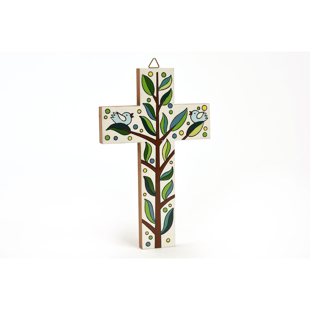 Croce decorata con i toni naturali del verde rappresentante l'albero della vita su base naturale di legno realizzata dalla cooperativa Semilla de Dios a El Salvador.